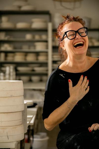 erfolgt eine sorgfältige manuelle Politur. Glasierte Innenseiten gewährleisten praktische Nutzung, während matte Oberflächen außen eine markante, sinnliche Qualität erzeugen. Feine Abweichungen im Produktionsprozess machen jedes Teil einzigartig.